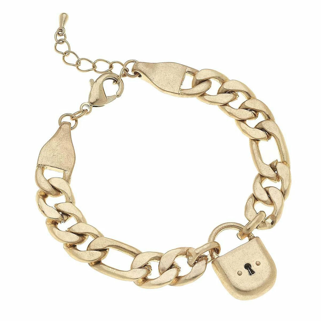 Embrace the reclaimed industrial fashion trend with chunky industrial curb chain bracelets with padlock details.