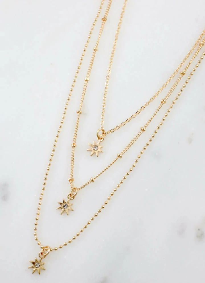 This delicate layered necklace has three different textured strands with petite sunburst CZ charms on each layer.