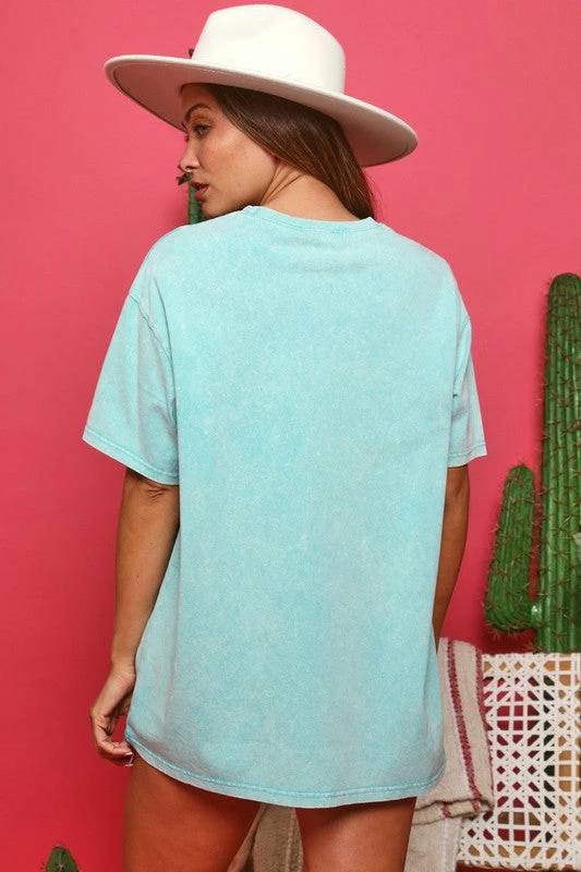 Trendy mineral washed turquoise graphic tee with the iconic smiley face in pink. The oversized fit makes this babe easy to pair with your distressed jeans, leggings, or favorite biker shorts. So cute and fun!
