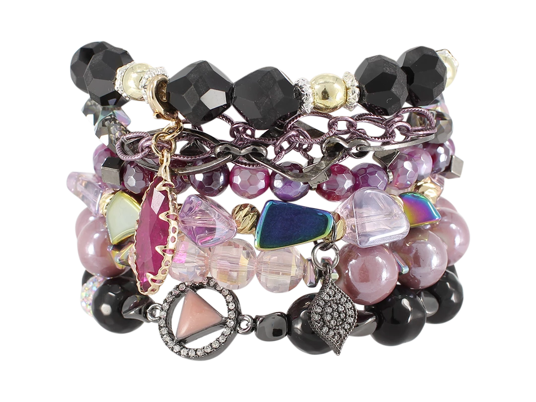 - This gorgeous stack is made up of black, mauve, and pink colored beads.