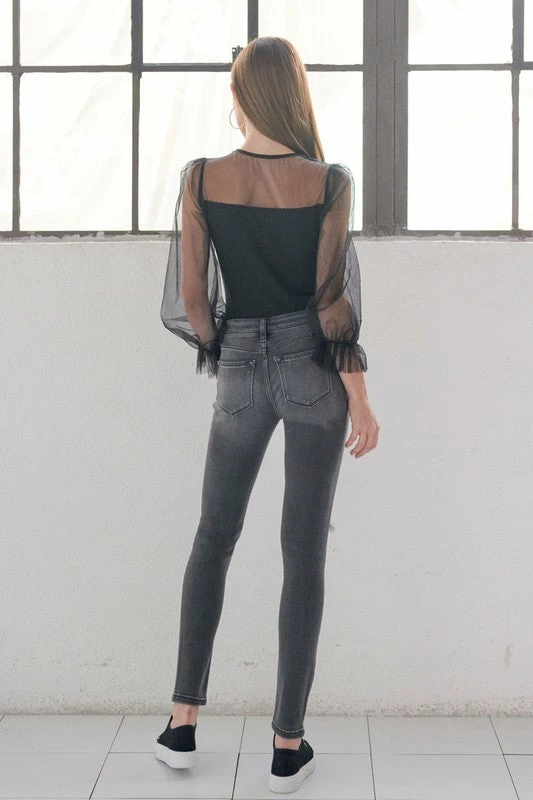 These trendy skinny jeans are such a must-have style for any season! We love the washed light black color. The perfect black jeans with distressing for a trendier style. It’s so easy to wear this style with a variety of tops, love them with a simple tee and a shacket.