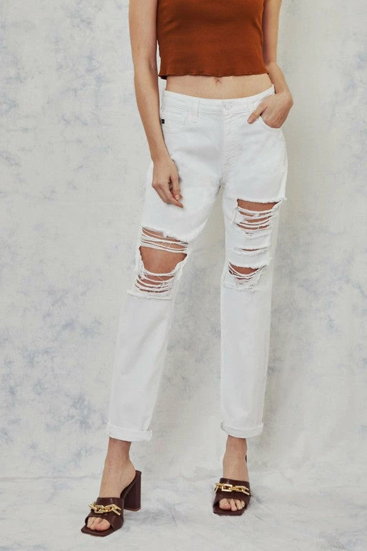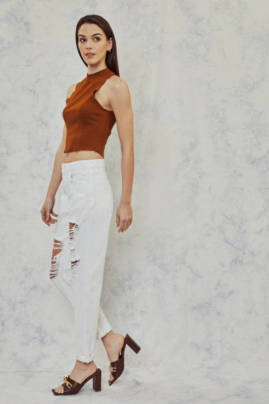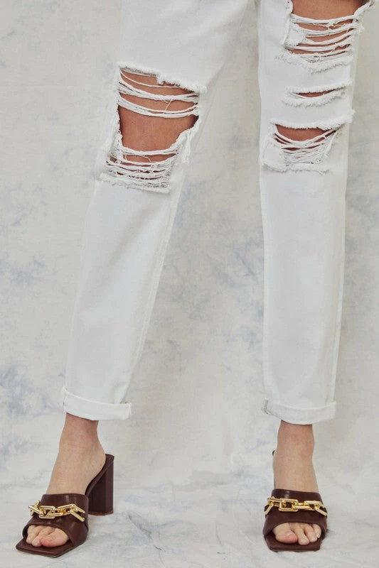 These trendy high waisted mom fit jeans are such a must-have style for any season! We love the timeless white denim and the distressed details. It’s so easy to wear this style with a variety of tops, layering tanks, and cardigans!