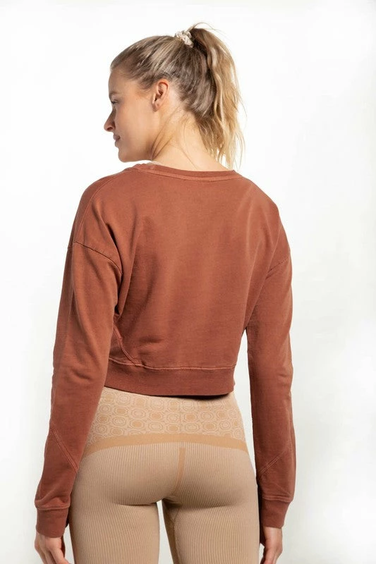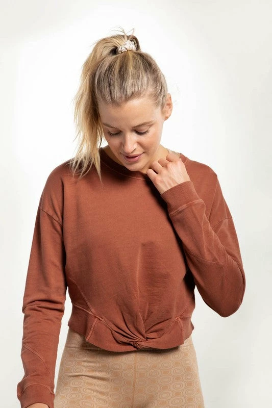 This lightweight pullover is perfect to wear with your favorite Mono B activewear. It is a cropped style and features mineral washed terry fabric with a twisted accent on the front, cuffed long sleeves, and a crew neckline.