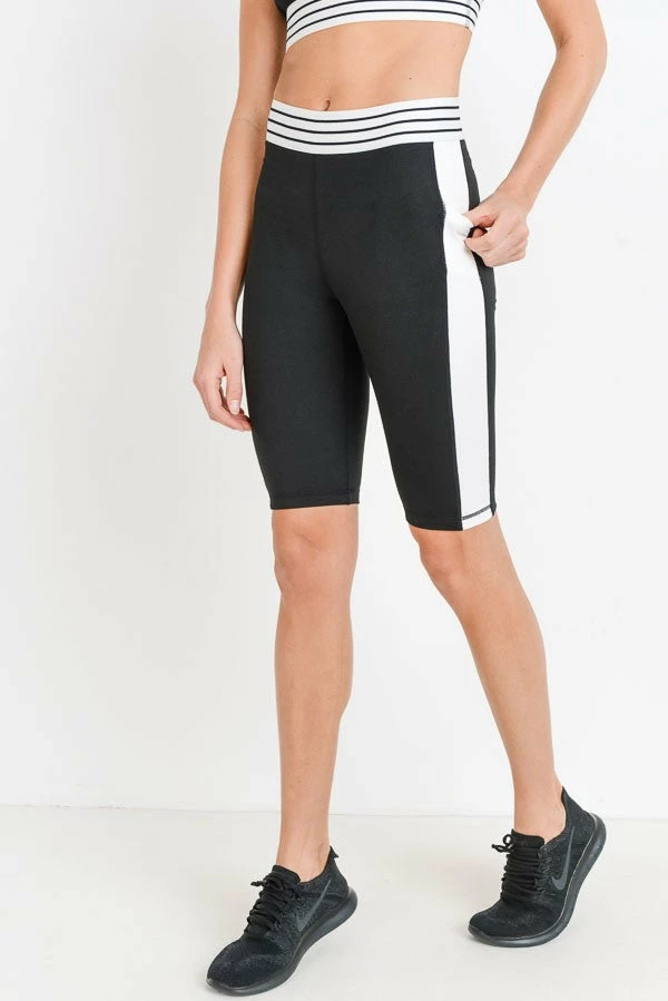 Be a black-and-white delight in these active biker shorts by Mono B! With its flattering white side panels, back pocket with white details, side pockets (perfect size for your phone), and striped elasticized waist band, these shorts are the perfect alternative to leggings. SHOP a matching sports bra HERE!