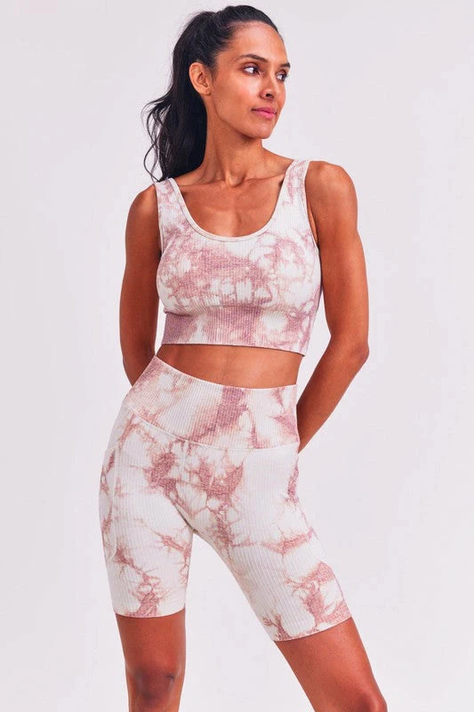 These seamless biker shorts feature an all-over tie dyed finish in a ribbed construction, as well as a high waistband for abs support (with a flattering sweetheart back) and side pockets for your essentials. These adorable mono b athletic biker shorts are sure to become your new favorite! Pair with the matching sports bra for the perfect outfit.