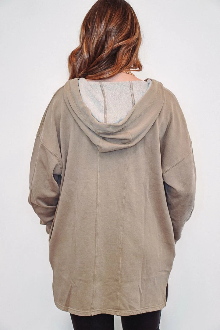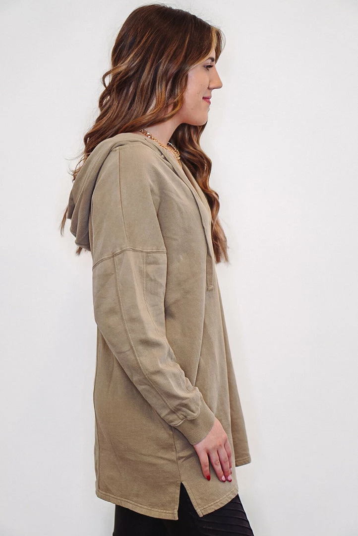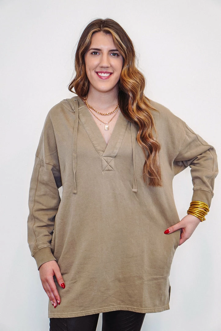 This mineral washed mushroom pullover feels just as cozy as it looks. Featuring a longline silhouette, a V-neck front, hoodie top (with drawstring closure), long sleeves, and brushed fleece inner shell. Super comfy!