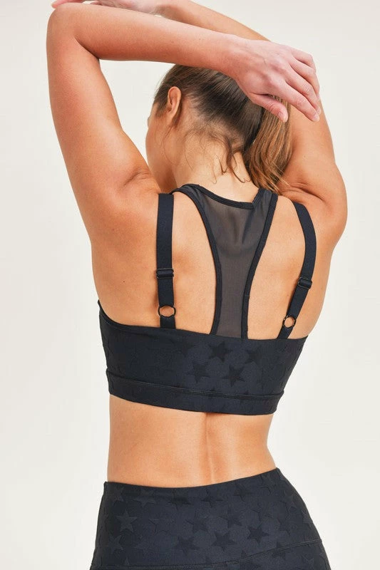This sports bra will have you seeing stars, quite literally. It is constructed from TACTEL-blend fabric with a star-jacquard texture and features a racer mesh design, adjustable straps, and a mesh overlay on the front. TACTEL is a soft, breathable, durable, supple, nylon 66 microfiber 20% lighter than most fabrics and dries eight times faster than cotton. Pair with the matching leggings Mono B Black Star Jacquard Leggings.