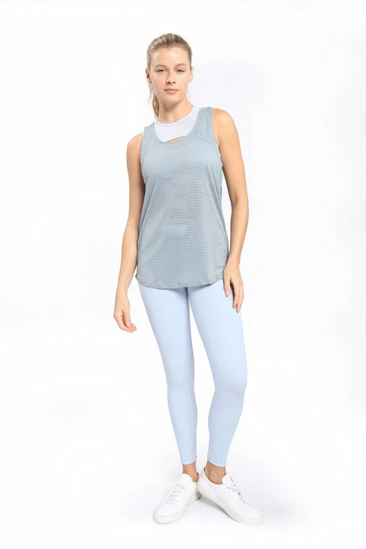This extremely lightweight athleisure muscle top was made from sheer striped mesh fabric for extra breathability. It has a crew neckline, semi-curved bottom hem, and a pinched back for a more fitted look. We love, love, love!