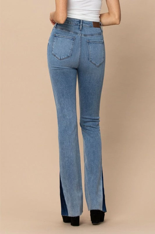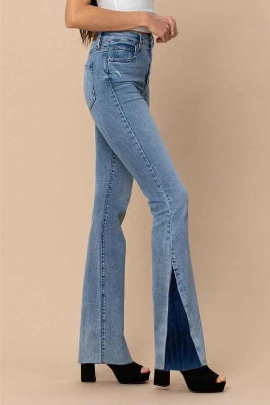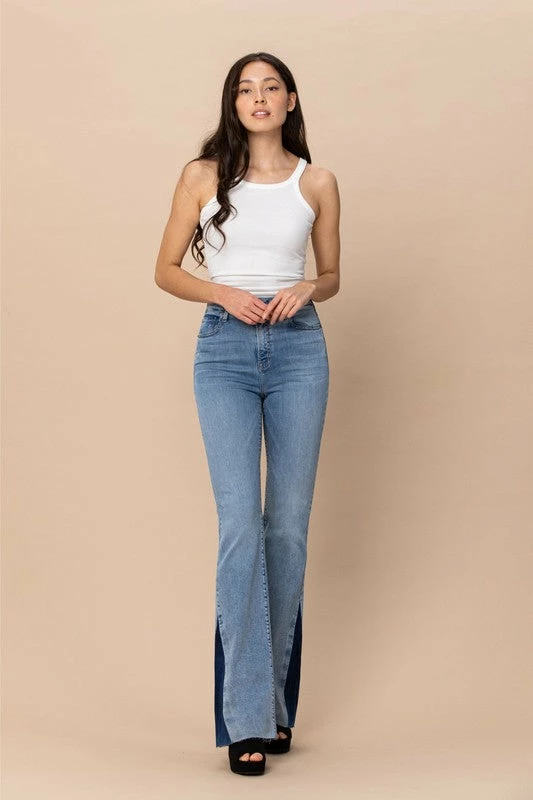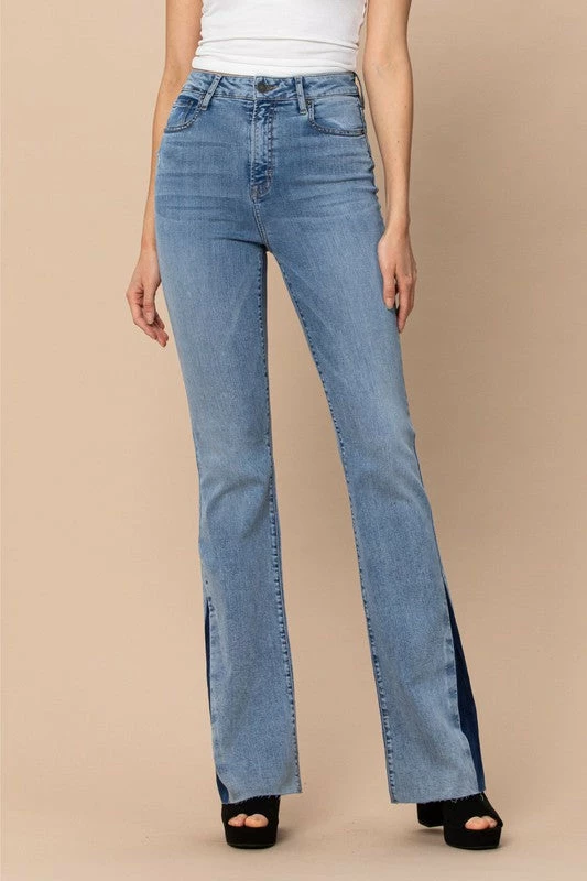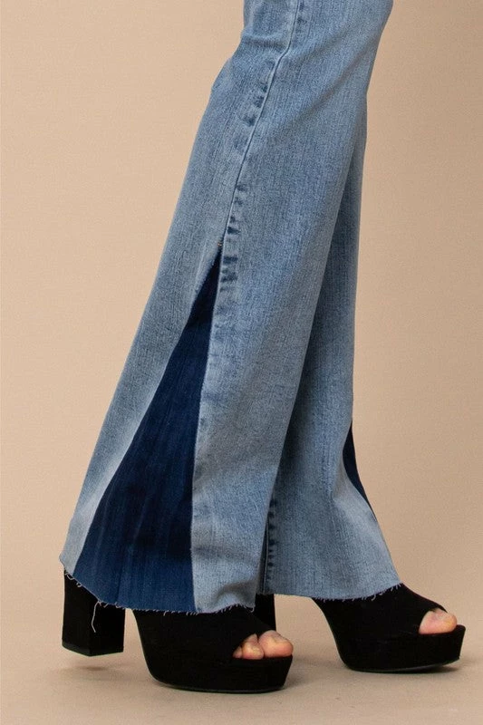 Blue light washed denim jeans with dark denim side panel flare