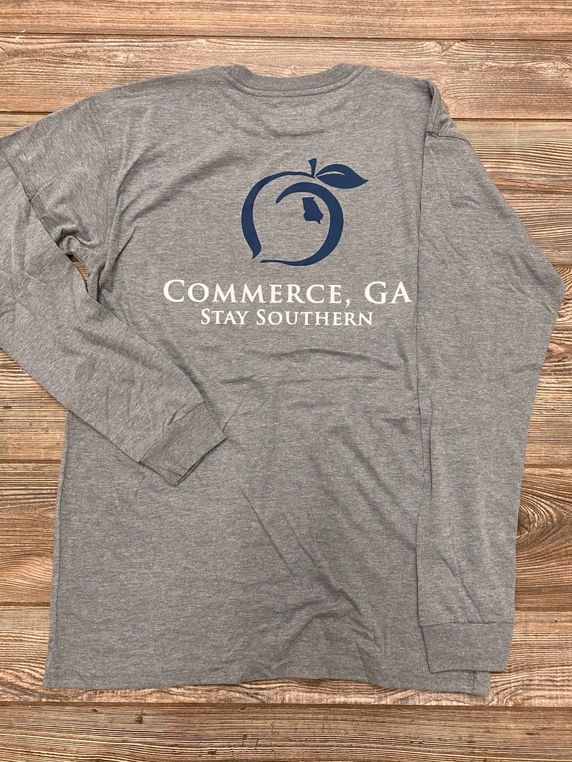 The Peach State Pride cotton long sleeve pocket t-shirt with a classic fit featuring Commerce, Georgia Stay Southern artwork.