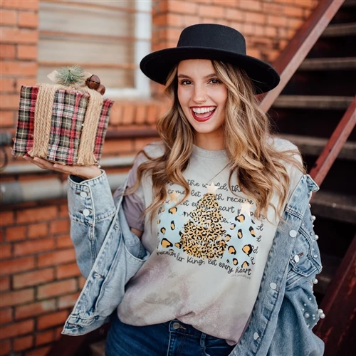 It’s time to rock your fabulous Christmas graphic tees. Joy to the world bleached pebble color. Features gold foil stars.