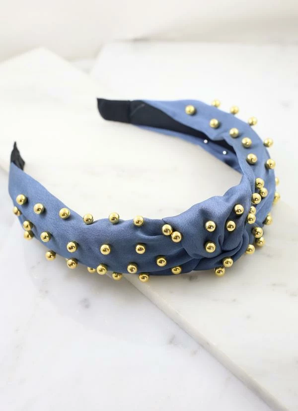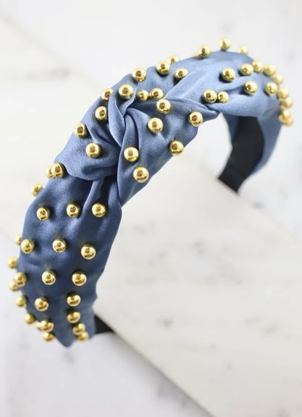 This satin feel knot headband is studded with gold balls for a great look. Perfect to finish any casual outfit or to wear for upcoming Holiday celebrations. One size.