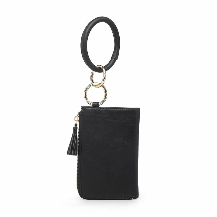 We love the bangle on this wallet! Inside is room for your credit cards and some personal belongings. Zips closed and decorated with a short tassel. So cute!