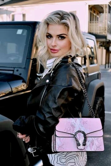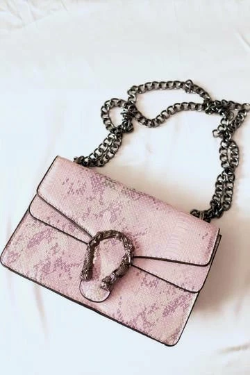 pink and silver snakekin print purse
