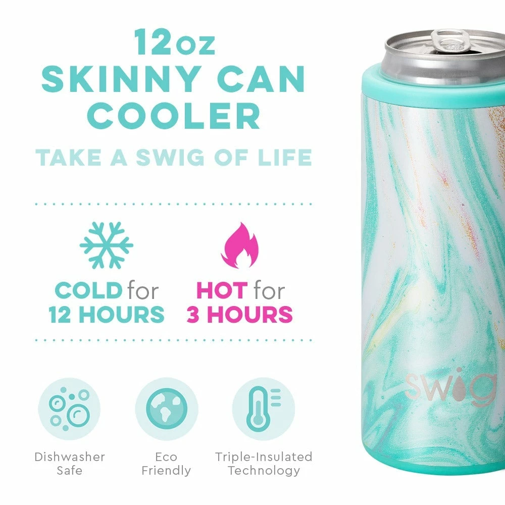 Swig Life Wanderlust skinny can cooler in swirled teal and gold