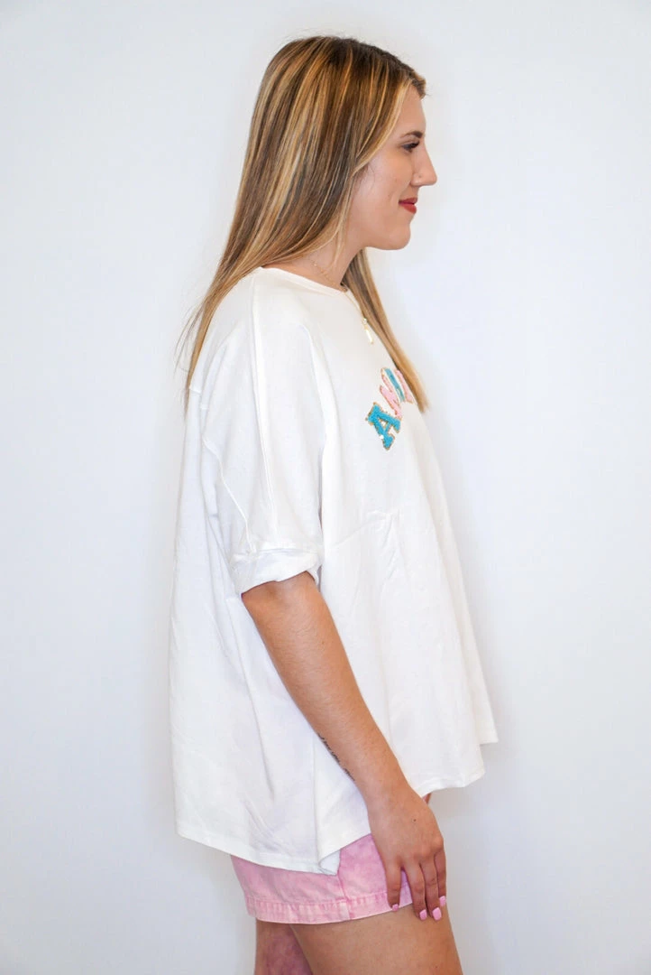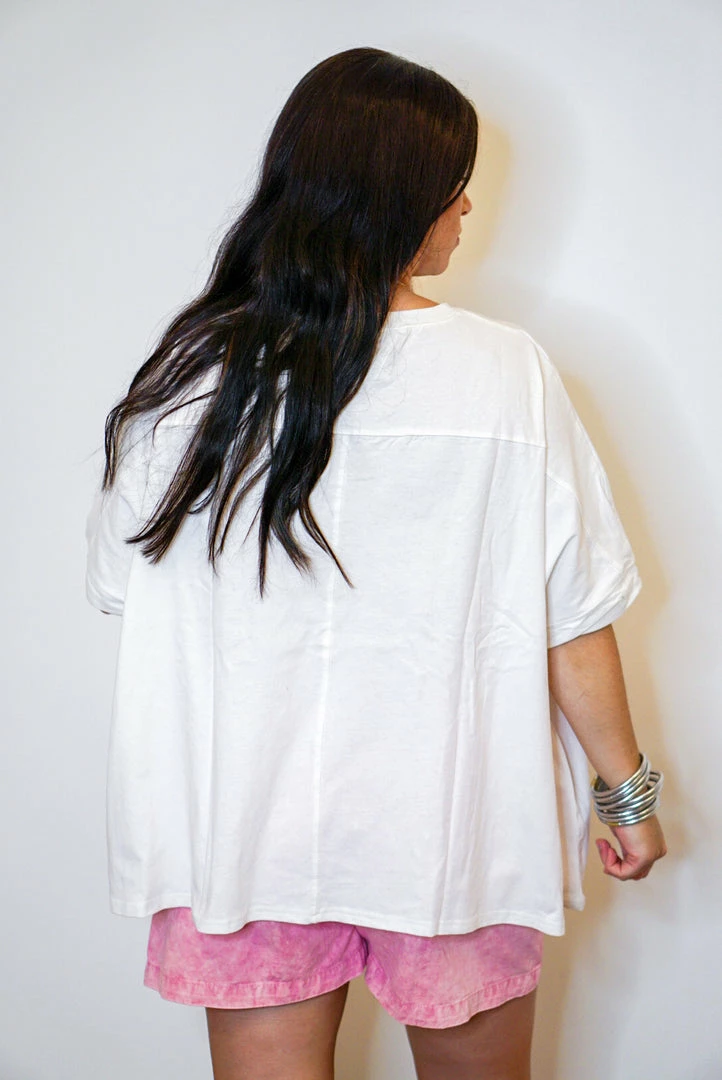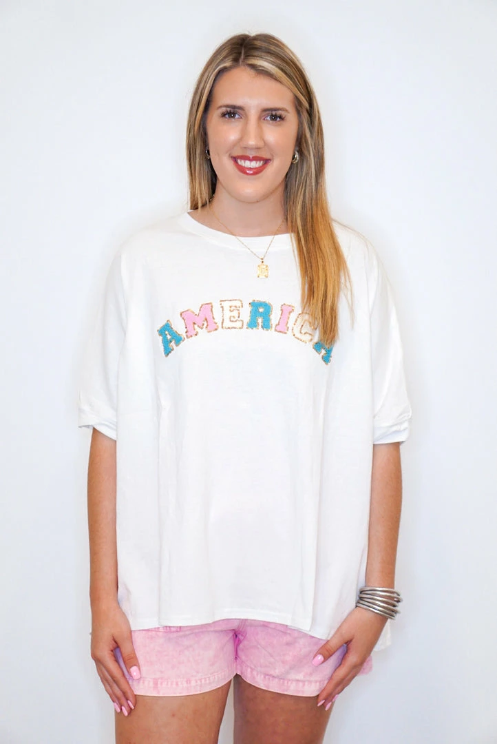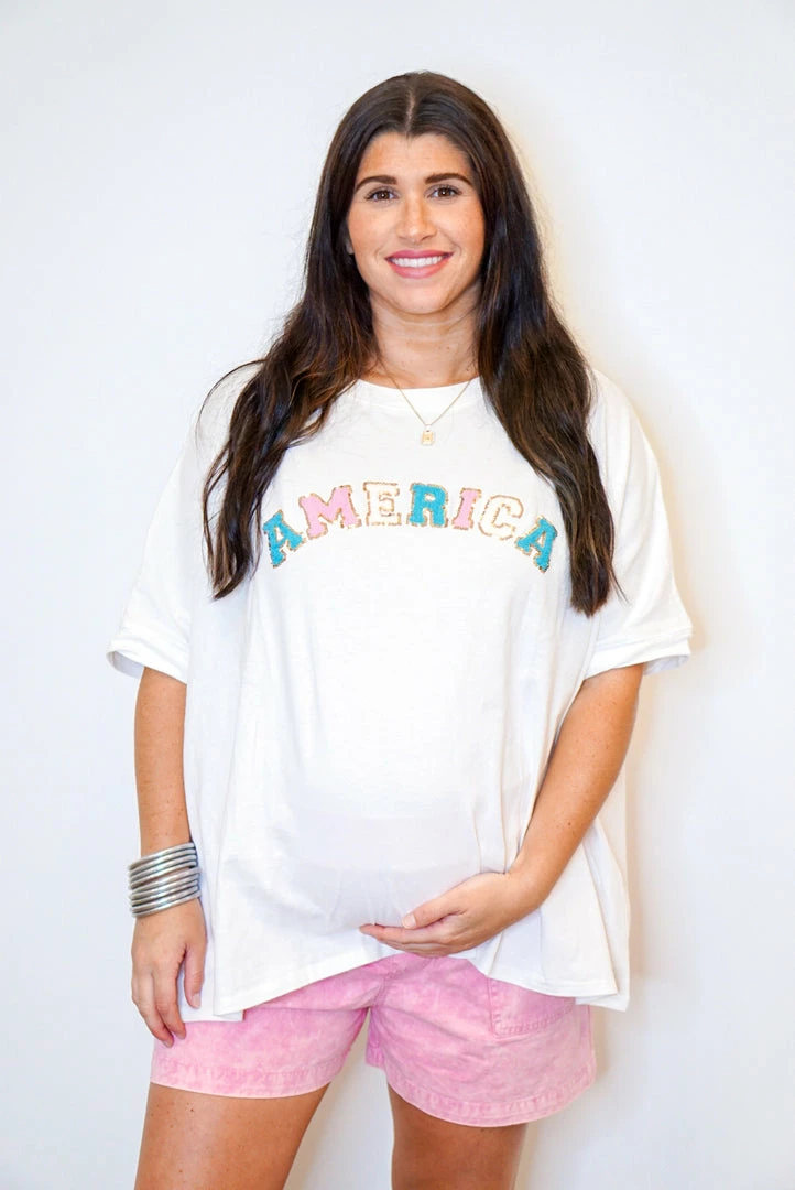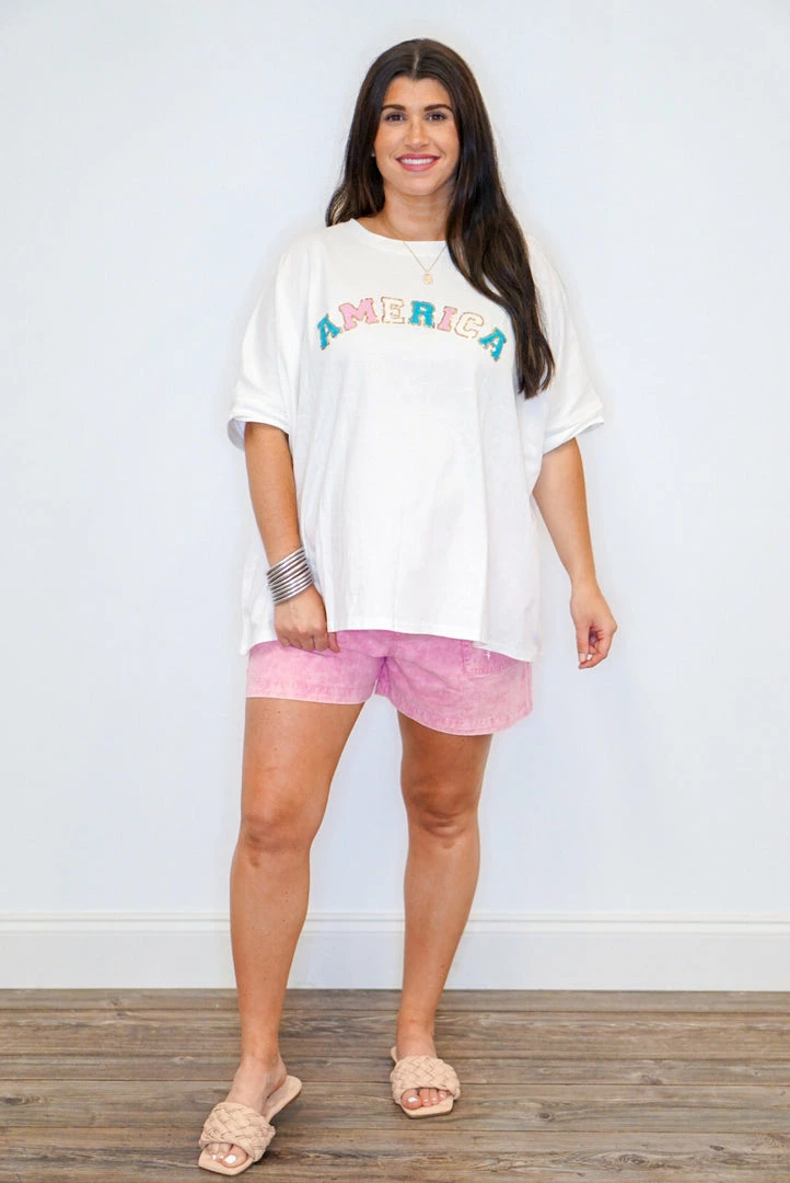 We love the oversized fit of this must have top and the patched America lettering decorating the front of it. This top is super cute styled with biker shorts or denim cut offs and sneakers. Perfect for all the upcoming patriotic holidays. Shop these comfy pink elastic waist shorts here! They match perfectly!