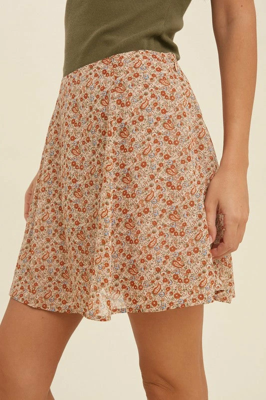 What a cute skirt! Apricot mini skirt features paisley floral print, elastic in back waistline, zipper closure on the side, and lined with shorts. So fun, and easy to dress up or down! Perfect with wedges or booties, and a cute denim jacket. Floral colors include ivory, blue, green, dark orange and light orange.