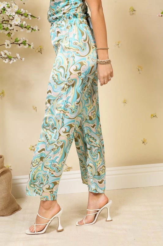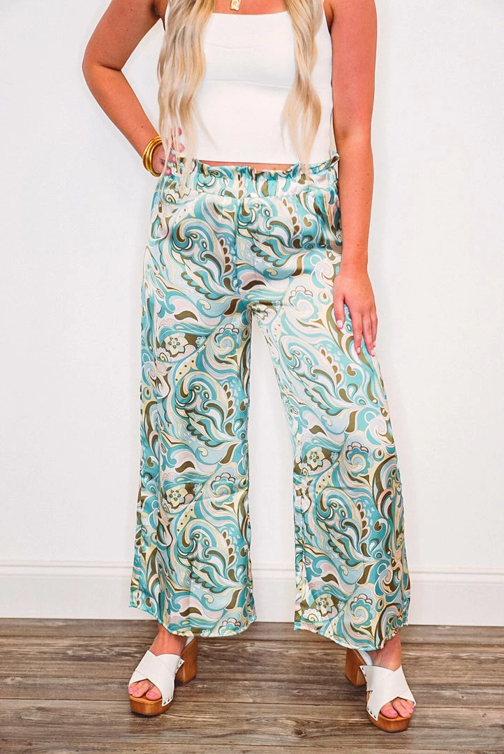 These lightweight aqua satin pants are perfect for everything from running errands to day dates. Pair with our Simple Days Tank and your favorite sandals or wedges for an easy but trendy look. Featuring an elastic highwaist and paisley print colors of aqua, lime, olive, light blush, sky blue, ivory, and pale yellow.