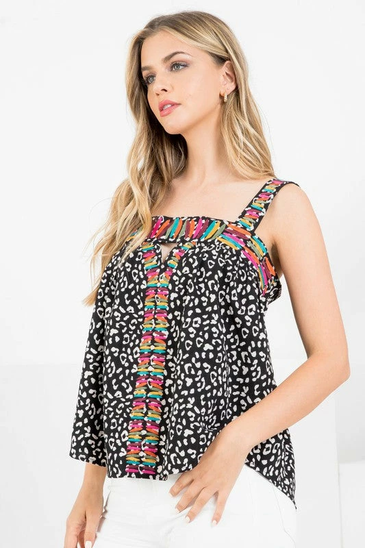 This adorable blouse is a new fun take on a classic animal print theme! Featuring a black and white cheetah print pattern, with multicolor embroidered shoulder straps, and a cutout square neckline with embroidered trim that also runs down the center front of the blouse. The lightweight crinkle fabric makes this one so comfy as well as super cute. We just love how fun she is! Embroidery colors: mustard, orange, hot pink, olive, burgundy, and teal.