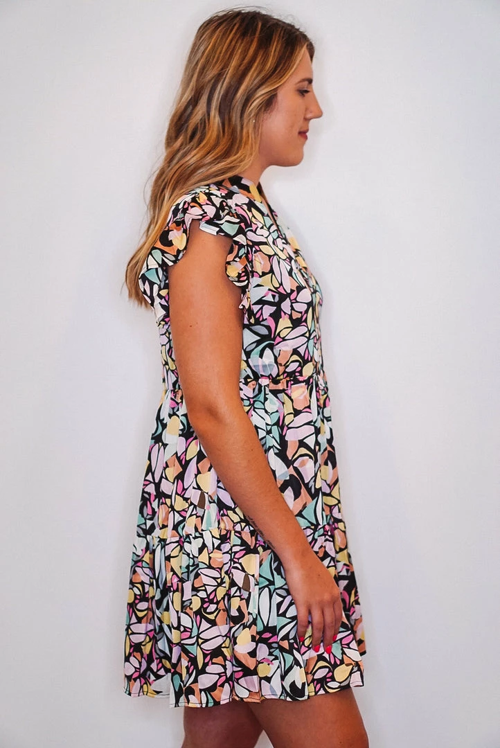 Get ready for all of your upcoming special events with this super sweet babydoll dress! Featuring a lightweight flowy black fabric with multicolor floral print, v neckline, ruffle capped sleeves, pockets, and tiered layers. This babe is perfect dressed up with heels, or wear her under your favorite cropped denim jacket with booties for a more casual look. Floral colors: light pink, dark pink, peach, seafoam green, pale green, light yellow, grey, and white.