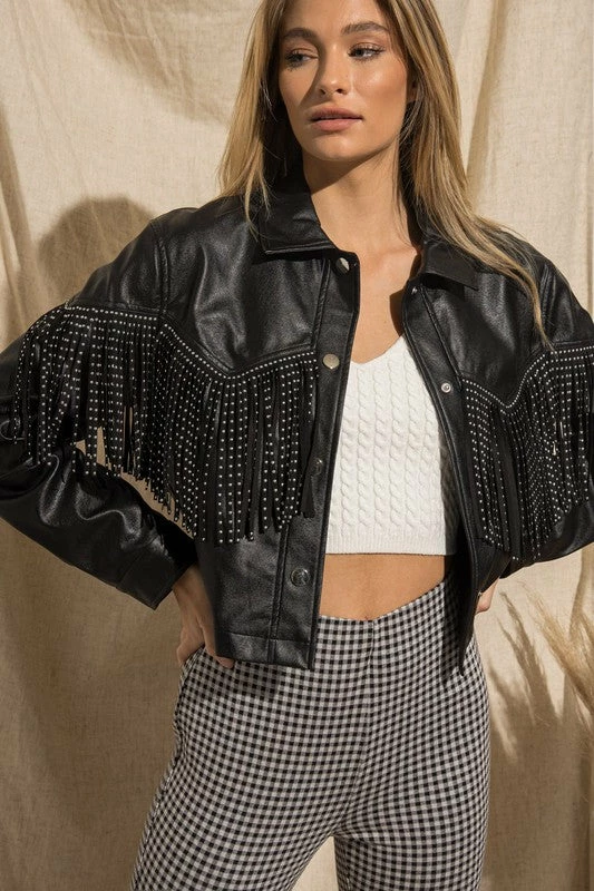 Black faux leather jacket with silver studded fringe