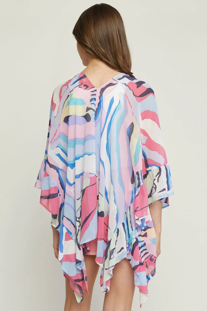 We are feeling all the Summer vibes with this fabulous kimono! Lightweight fabric in an open style, featuring draped sleeves with ruffle detail, and a relaxed flowy fit. Perfect for those upcoming Summer days! Colors: light blue, dark blue, navy, pink, lavender, teal, mint, and white.
