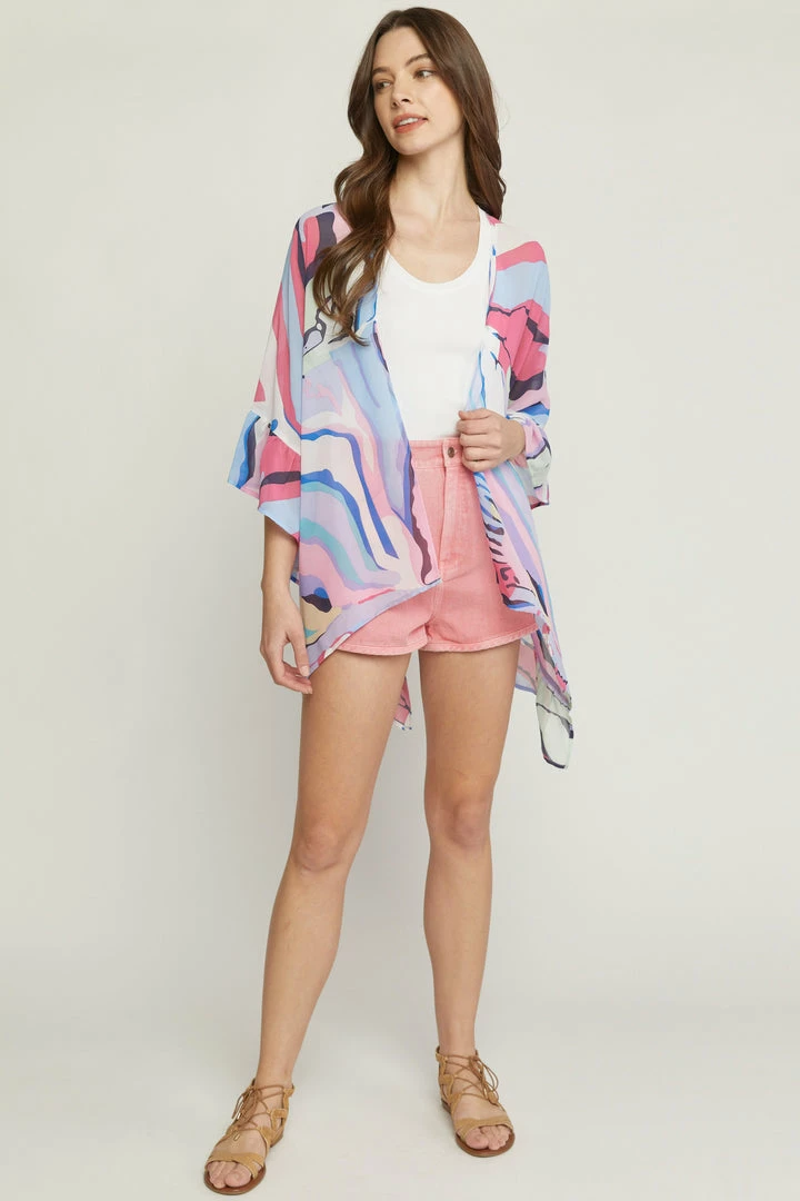 Blue and pink abstract printed lightweight kimono