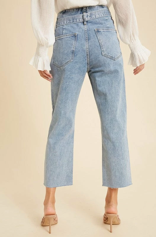 The ultimate paperbag pants, such a staple piece in your closet! Everybody needs a good go-to pair of denim jeans for dressier occasions and THIS is the perfect one. Featuring button and zipper closure, denim self tie belt, wide leg, raw hemlines, and functioning side and back pockets. Such a flattering fit while still being very comfortable, and fun!