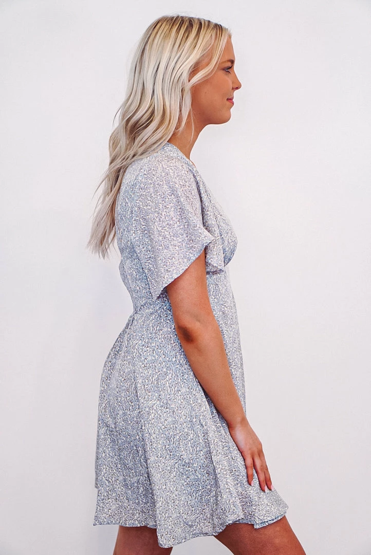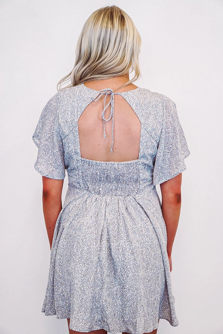 Get ready for Spring with this super cute mini leopard print dress. Featuring a v neckline in front with a self tie open v neckline in back, smocked detail in back, and short flounce sleeves. This babe is a lightweight flowy blue fabric with ivory and gray mini leopard print, and is as comfortable as she is cute! Perfect worn alone with sandals, or under your favorite cropped denim jacket with booties.