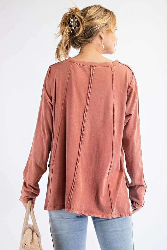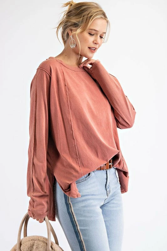 We are having all the love for this boxy knit pullover top! So comfy, and super cute, featuring mineral washed strawberry cream knit, crew neckline, raw seam details, long sleeves, and side slits in the bottom hemline for added comfort. You will love how great you feel in this babe, while running errands, hanging out with friends, or enjoying a much deserved day off. Soon to be your new favorite go-to!