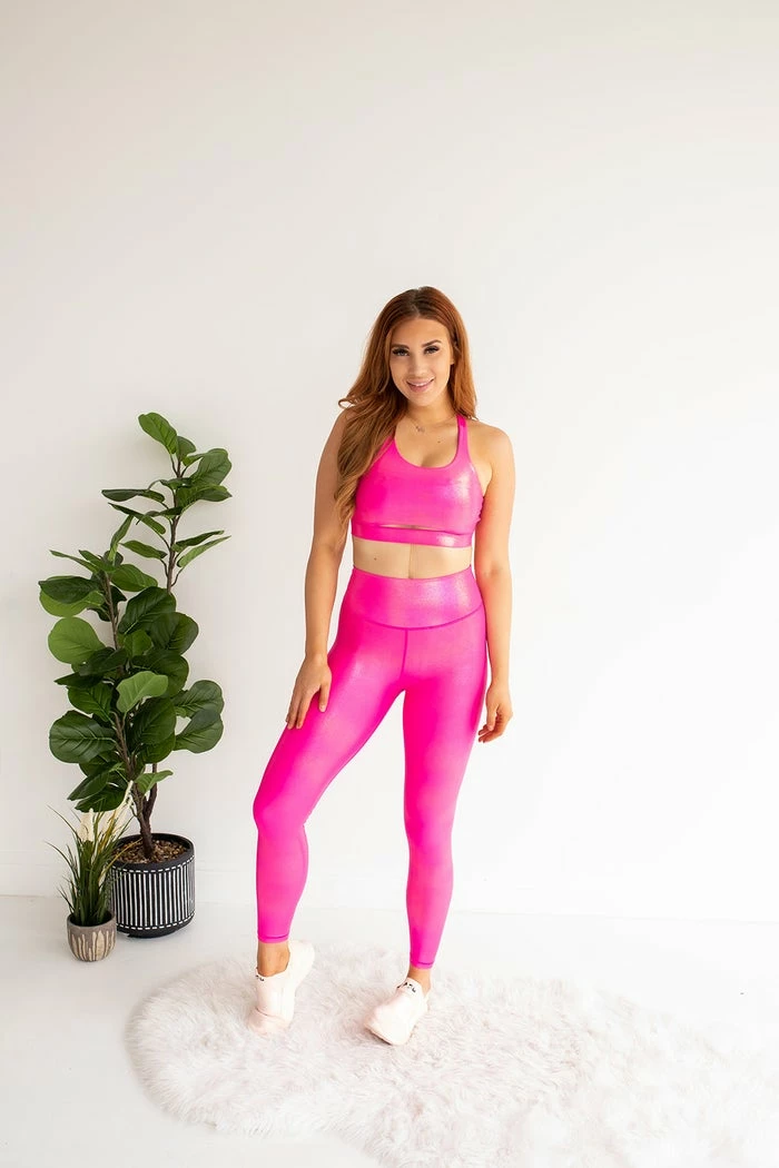 We LOVE our leggings! This pair features a barely there fabric in full coverage, smoothing out any imperfections while maintaining a medium – high compression. Don’t mistake this smooth, lightweight fabric as lesser. It’s a tight knit fabric that maintains support while giving you 100% mobility. Pair with the matching sports bra: Bronzed Hot Pink Sports Bra.