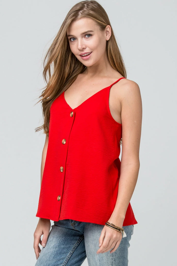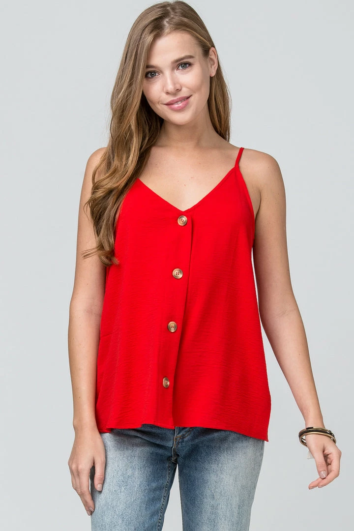 Solid button-up camisole top featuring v-neckline. Adjustable straps. Non-sheer. Woven. Lightweight.