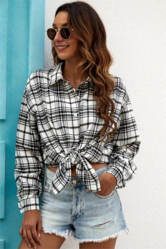 If you want the shacket look but prefer something lighter, this will be your favorite go-to. Perfect for layering with your graphic tees but also super cute worn alone! Black and white plaid flannel, in a traditional button down style. Oh so comfy!