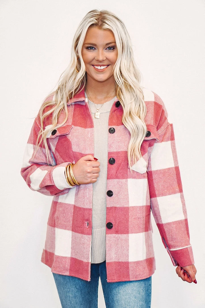 We are so in LOVE with this pink and white plaid flannel shacket! This babe features a button up style, two front chest pockets that button close, and a soft mid weight fabric to keep you warm and cozy. She’ll be the perfect addition to your wardrobe and great to layer with your bodysuits and jeans. We love the relaxed fit… this shacket is a must have!!