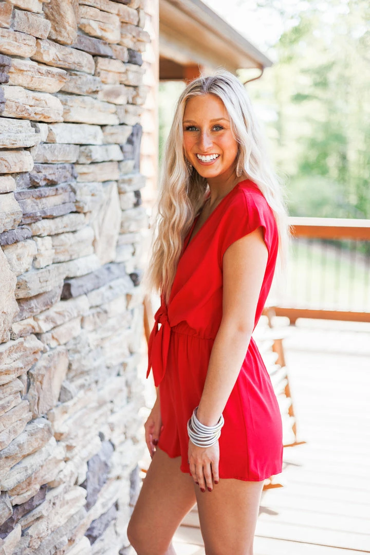 Get ready for all of your favorite upcoming events with this super hot romper! Featuring a v neckline in front and a slit back with a button closure at the neck, capped sleeves, and elastic waist with a tie detail in the front. Perfect dressed up with heels and a chunky necklace, or make it beachy with some sandals!