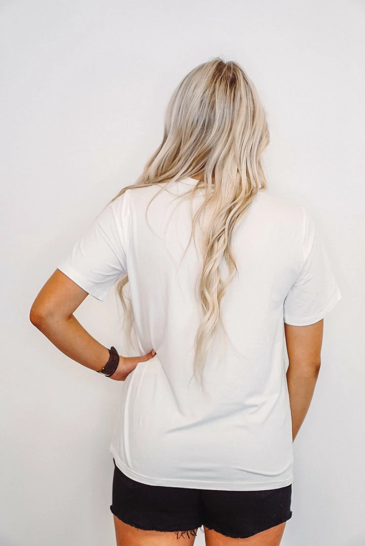 This new Dreamer graphic tee is so cute! Short sleeve ivory tee, featuring a desert scene in black and white, with a blue night sky, and Dreamer written in red. It soothes the soul just looking at this scene! Perfect under your favorite blazer for a fun trendy look, or thow her on with your denim shorts for a casual day out.