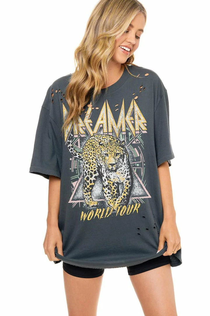 Trendy little must have tee! Distressed graphic tee in slate featuring a crew neckline, short sleeves, and the words Dreamer World Tour in vintage print with a leopard printed in the middle. Perfect with some biker shorts!
