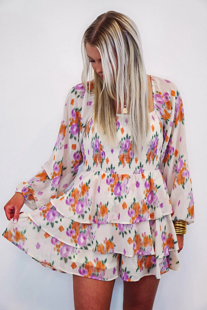 Get ready for all of your favorite upcoming events with this super cute floral print romper! Featuring a square neckline with smocked top, elastic cuffed long sheer bubble sleeves, and ruffle tiered layers. This flowy babe is ivory with a floral print of lavender, oranges, and greens, and is as comfortable as she is cute! Perfect dressed up with heels and a chunky necklace, or dressed down with your favorite cropped denim jacket and booties.