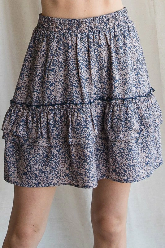 What a cute floral print ruffle skirt! Blue mini skirt features elastic waist and ruffle details. Lined with shorts. So fun and easy to dress this skirt up or down! Perfect color for Summer and Fall, making this babe a great transition piece.