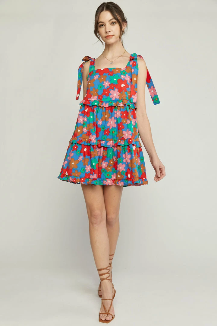 We have all the LOVE for this pretty beauty! Blue ruffle tiered mini dress featuring self tie adjustable shoulder straps and a chic square neckline. This cutie is fully lined, and fits true to size with a flowy lightweight fabric. We know you’re going to love this one as much as we do! Floral colors: tomato red, pink, tan, light brown, and off white.