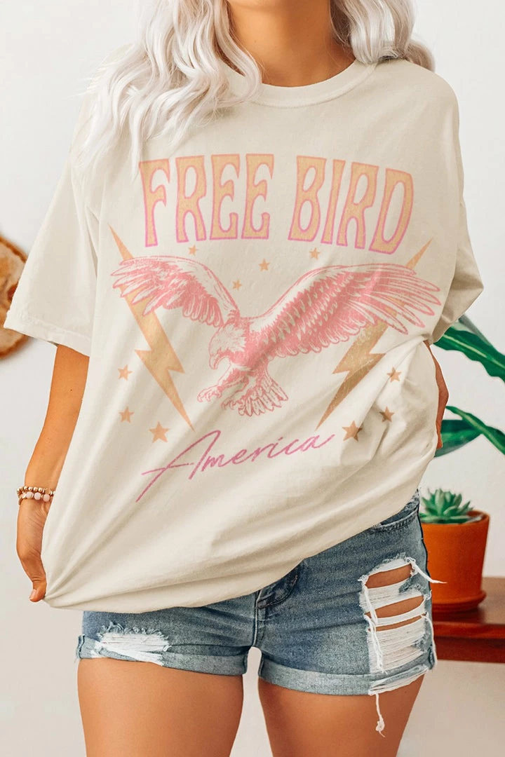 Free Bird!! OMGoodness this is the cutest graphic tee! Loose relaxed fit in vintage white, featuring multi color retro typography ‘Free Bird America’ with an Eagle and lighting bolts. Too perfect!!