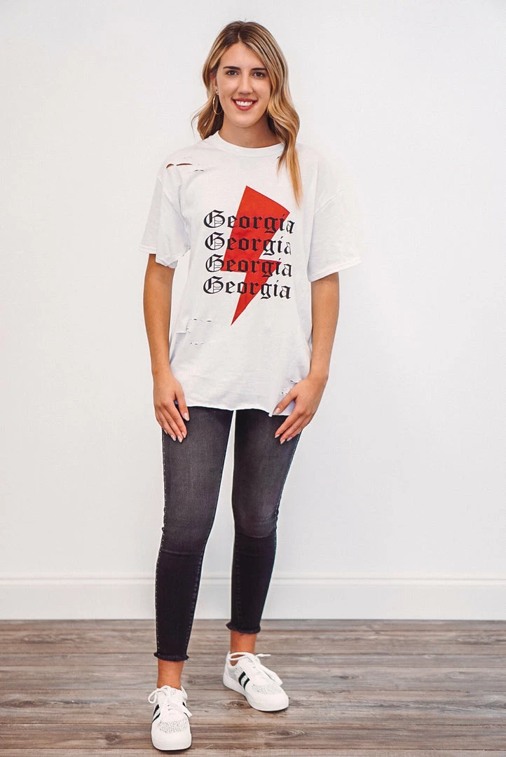 Cheer on your dawgs in this cutie of a tee! Pair this mildly distressed t shirt with your favorite denim and add boots or sneakers and your set for tailgating!