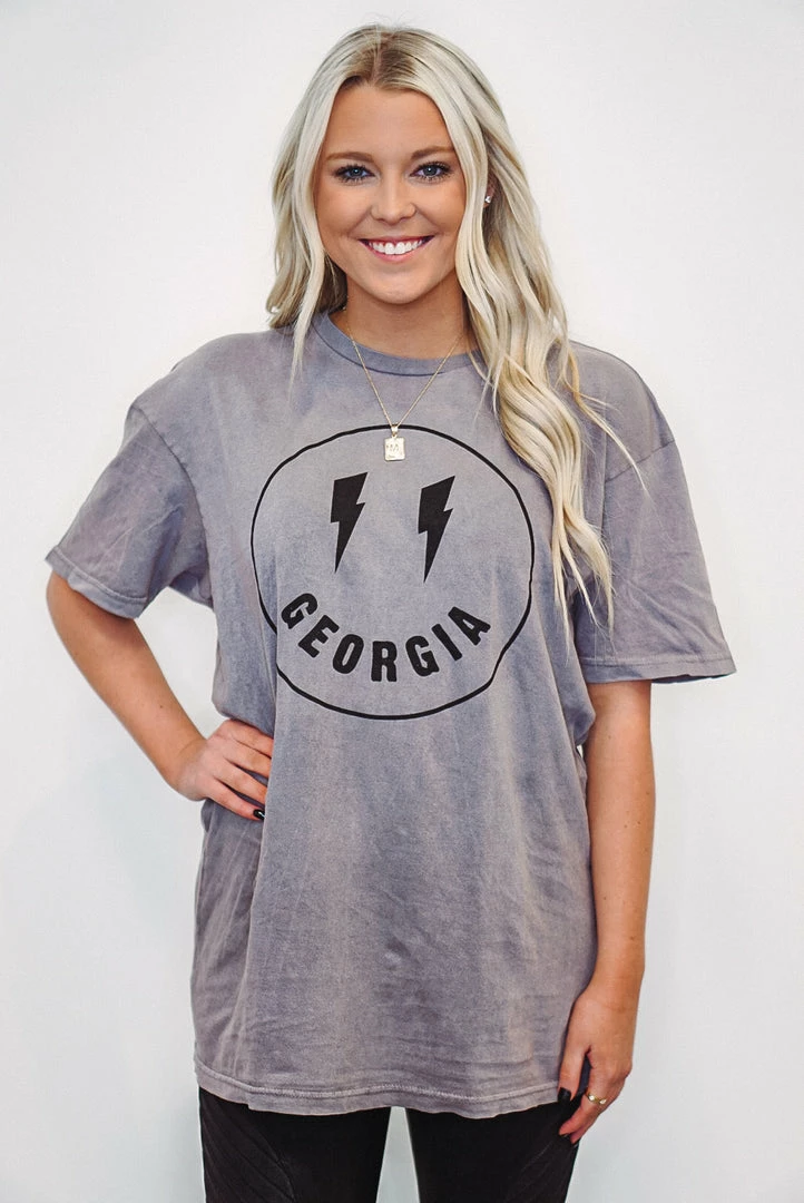 The perfect smiley face graphic tee for cheering on the UGA Bulldogs! We are a big dawg fan and a fan of this tee! Pair with denim or Spanx leggings to layer with a leather jacket. The ultimate football gameday top!