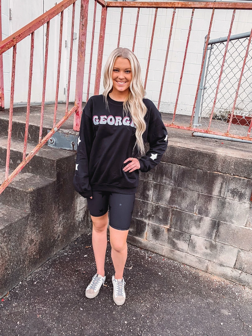 Yelling go dawgs while staying cute and cozy in this favorite Georgia stars black pullover sweatshirt. Paired with the Mono B star biker shorts!