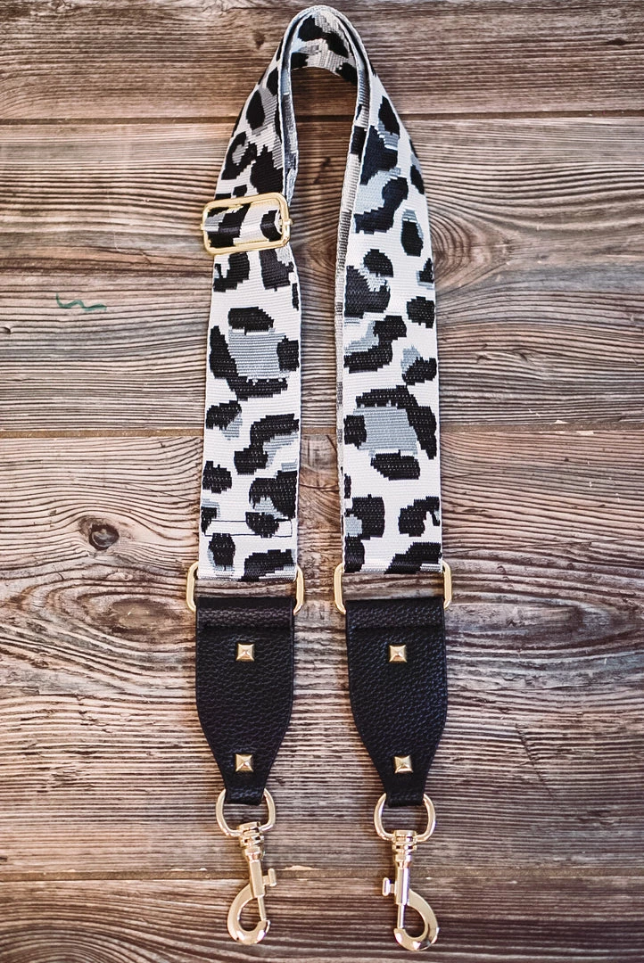 Only the cutest grey leopard print guitar straps to match on of our interchangeable crossbody bags!