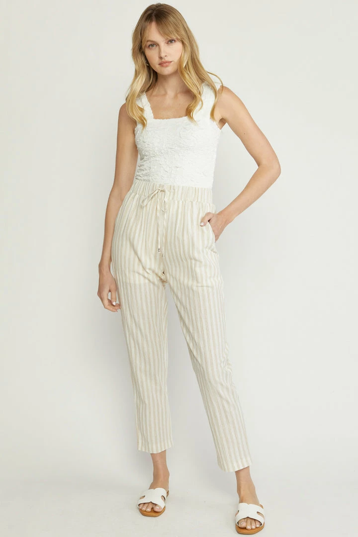 These lightweight taupe and ivory striped pants are perfect for everything from running errands to day dates. Pair with a simple tee and your favorite sandals or sneaks for an easy but trendy look. These cuties have side pockets, drawstring elastic high waistband, tapered ankle, and are lined with shorts.