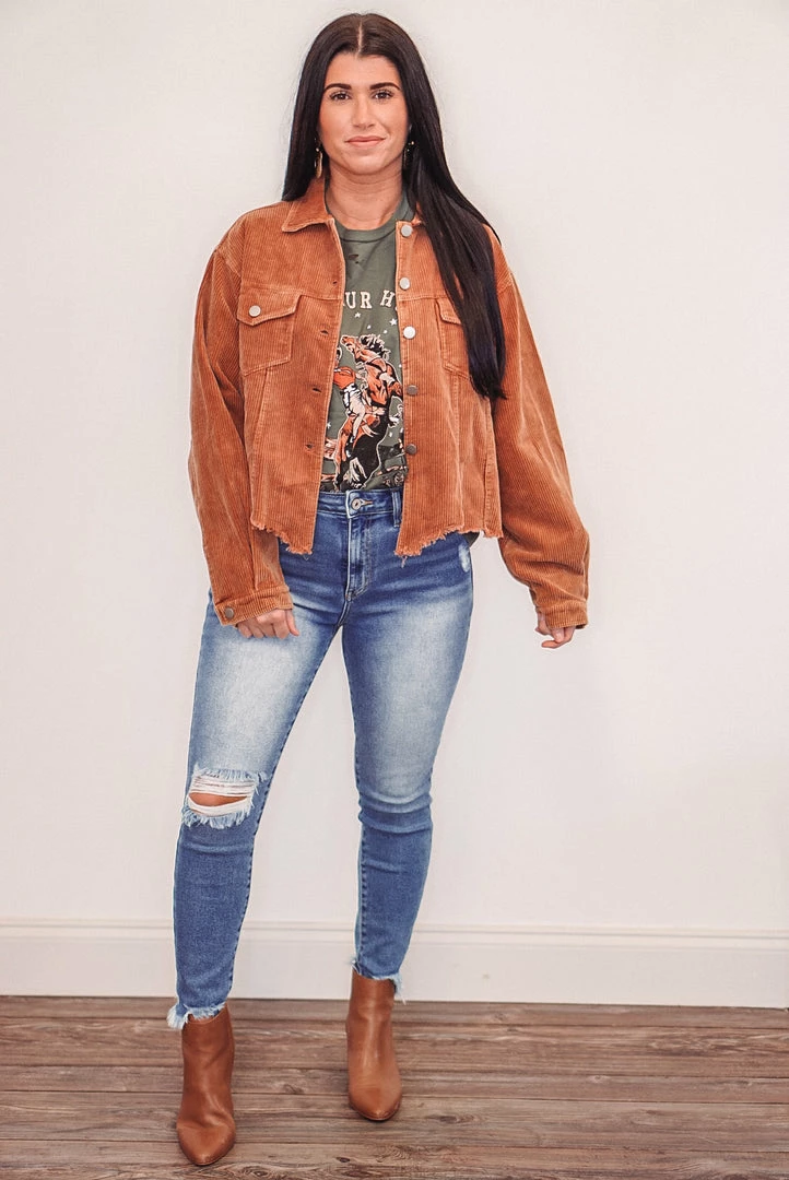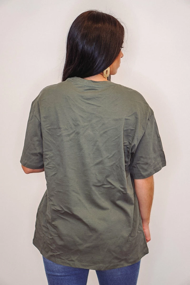 Hold your horses western cowgirl olive graphic tee. Tee features distressing throughout (small holes). We love this tee paired with the ‘Feeling Autumn Corduroy Jacket’
