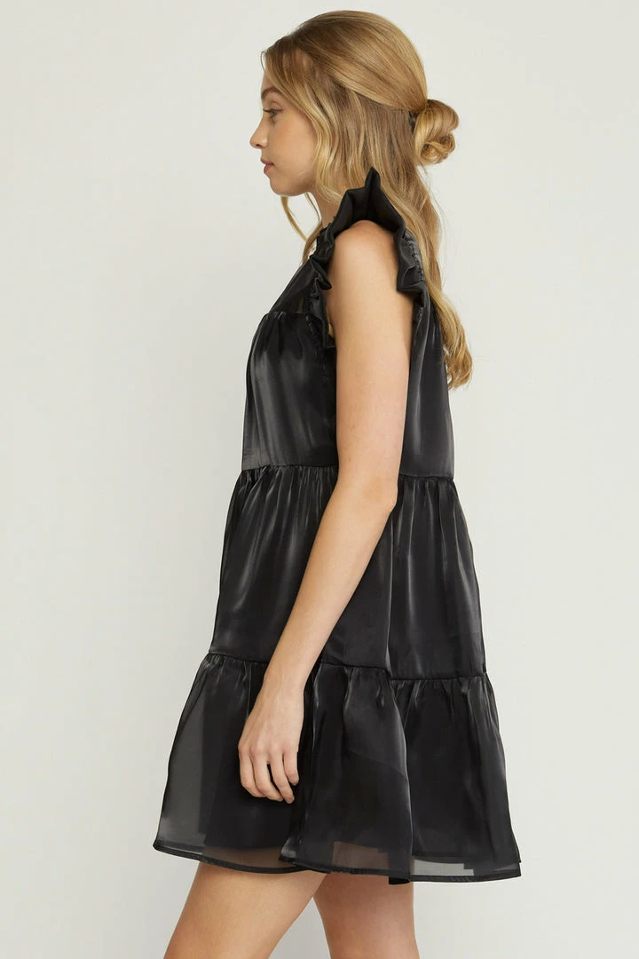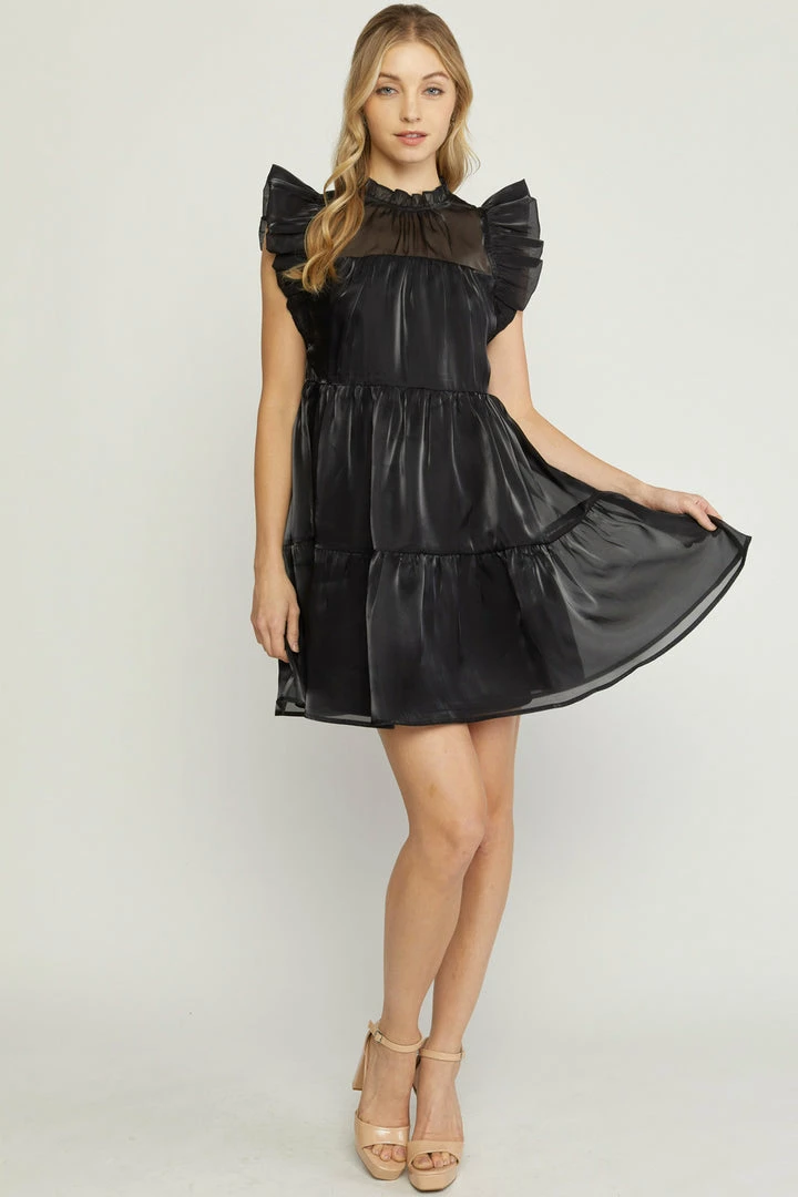 Sweet meets sassy in this super cute black babydoll dress. Featuring an iridescent flowy fabric, tiered layers, ruffled mock neck with double button closure in back, and ruffle capped sleeves. This one will be perfect dressed up for all of your upcoming events, and is so pretty!