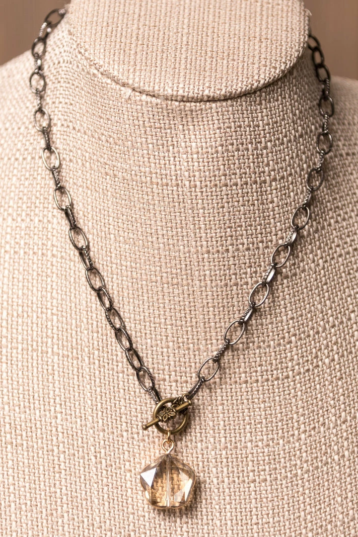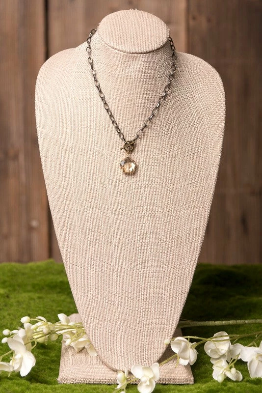 Chain link necklace with a toggle closure at the bottom next to the flower shaped faceted glass pendant. Beautiful dark metal and perfect for layering.