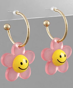 Nothing is cuter than these hoops! Pink flower smiley face worn gold drop hoop earrings. Perfect for Spring and Summer!!